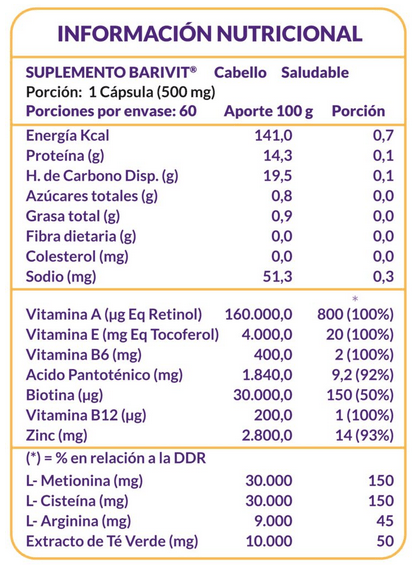 Barivit cabello saludable es un suplemento alimentario formulado para ayudar a acelerar el crecimiento del cabello y disminuir su caída.